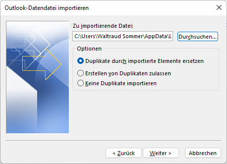 - Navigiere mit Hilfe der Schaltfläche Durchsuchen zu der PST-Datei, die Du importieren möchtest. Wähle unter Optionen aus, wie E-Mails und Kontakte gehandhabt werden sollen, und dann weiter.